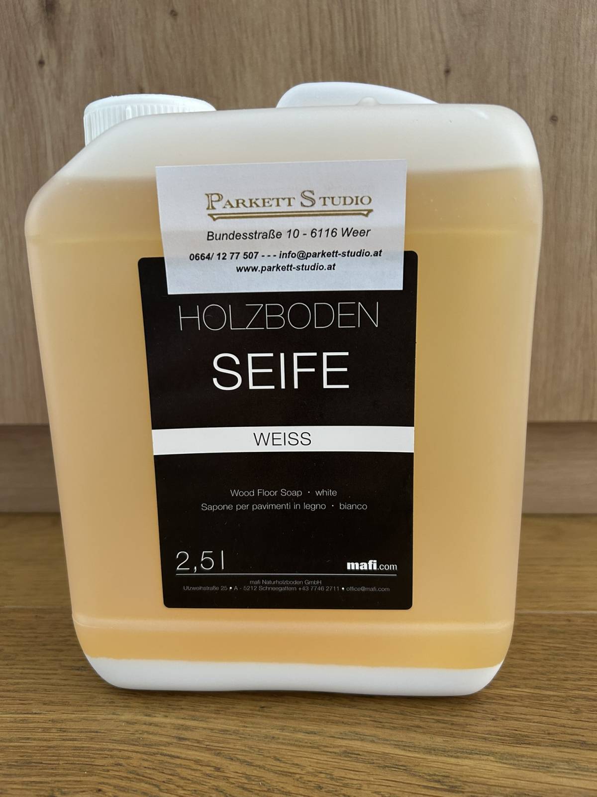 Die mafi Pflegemittel sind Reinigung und vor allem Pflege in Einem! Die mafi Holzbodenseife weiss hat einen sehr hohen Fettanteil und wirkt daher wie ein leichtes Nachölen auf dem Boden. Die mafi Holzbodenseife wird für Parkettböden mit weiß geölter Oberfläche verwendet.