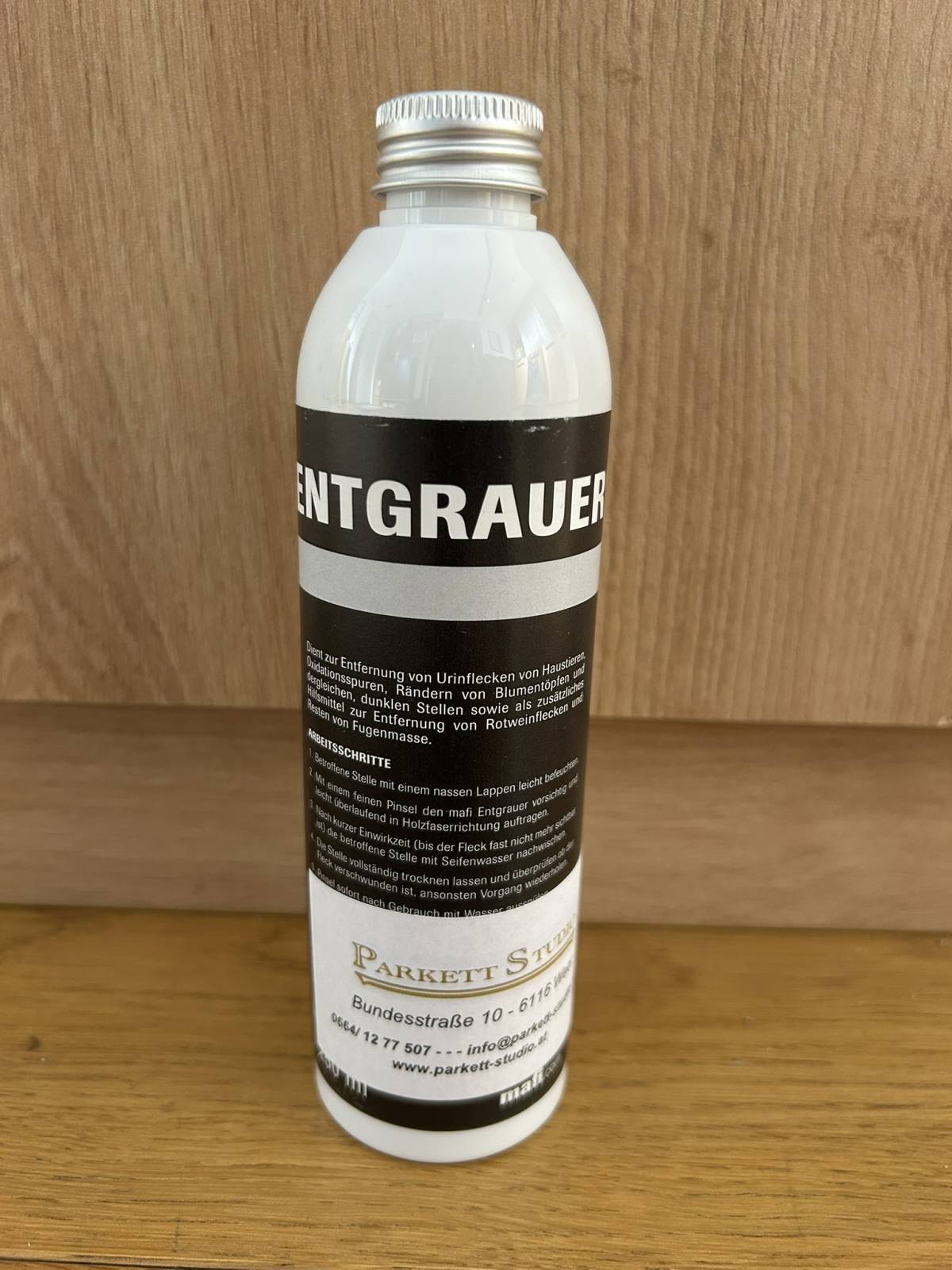 Die betroffene Stelle wird zuerst mit Wasser angefeuchtet. Anschließend wird der Entgrauer mit einem Pinsel auf die betroffene Stelle aufgetragen und nach kurzer Einwirkzeit mit Wasser in Kombination mit der mafi Holzbodenseife ausgewaschen. Der Vorgang kann mehrmals wiederholt werden.